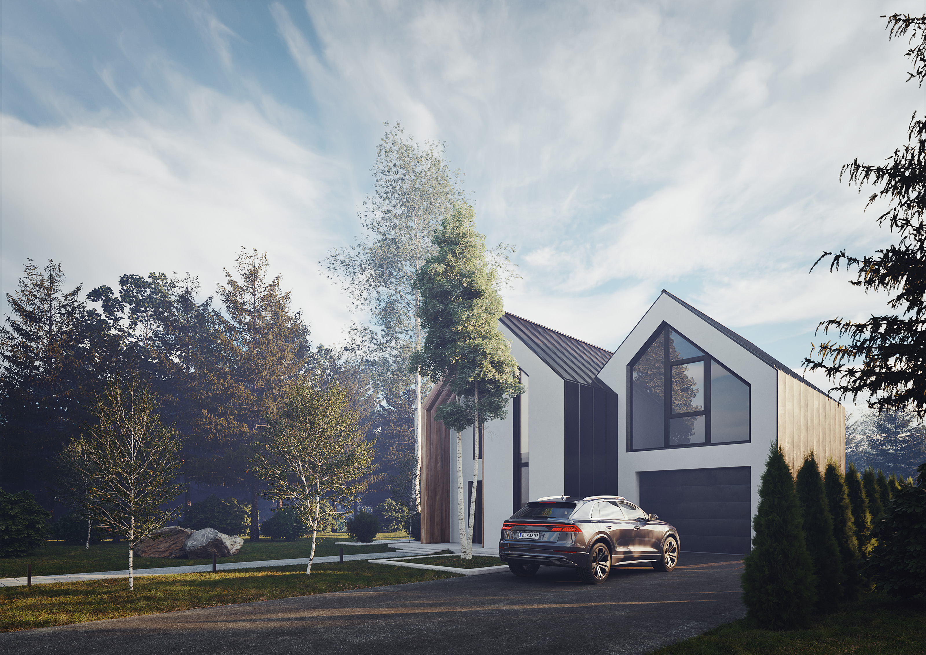 Exterior visualizations for a contemporary Nordic-inspired residence defined by steep roof lines, clean volumes, and natural material accents. The images focus on the relationship between architecture and landscape, soft daylight, and a calm residential atmosphere suited for architectural presentation and design communication.